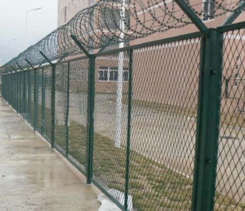 監獄巡邏道隔離網整體設計高大、美觀、實用,網墻的設計具剪切、防攀爬功能,能夠十分有效的防止罪犯的潛逃。監獄巡邏道鋼網墻V型架頂端安裝刀片刺網,直徑采用50cm-60cm刀片刺網主要是由熱鍍鋅鋼板或不銹鋼薄板沖壓而成的,它擁有尖銳的刀片,高張力鍍鋅鋼絲或者不銹鋼絲做芯線組合而成的產品。